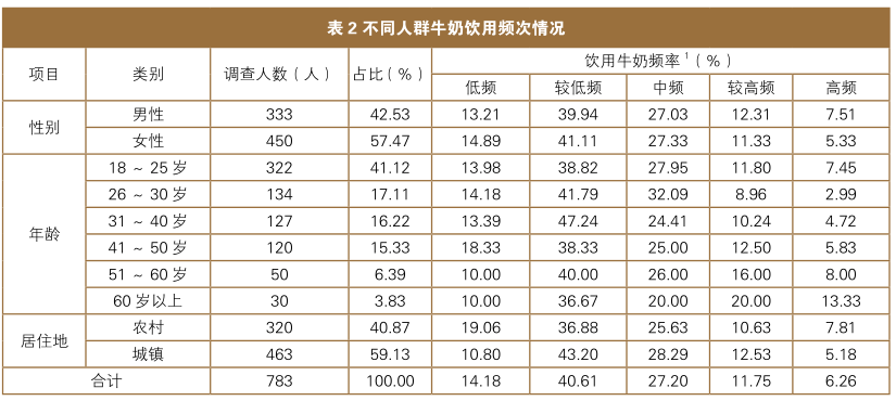 注:1此部分仅对可以接受饮用牛奶的783名被调查者进行分析,其中饮用牛奶频率根据预调研结果分为5类,其中每周不到1 次定义为“低频”,平均每周1~2次定义为“较低频”,平均每周3~4次定义为“中频”,平均每周5~6次定义为“较高频”,平均每周7次及以上则被定义为“高频”