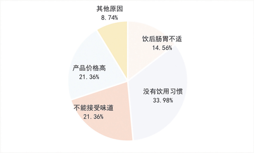 首先对被调查者的牛奶饮用情况进行分析,发现在886 个样本中有783 名(占比88.37%)被调查者在日常生活中会主动饮用牛奶,有103 人(占比11.63%)平时几乎不饮用牛奶。对不饮用牛奶的原因进行整理后发现,没有饮用习惯是居民不饮用牛奶的主要原因,占比33.98%;同时,生理原因也是造成居民不消费牛奶的重要原因,有21.36%的不饮用牛奶者是因为无法接受牛奶的味道,还有另外14.56%的居民表示自己在饮用牛奶后肠胃会有不适,同样在日常生活中拒绝饮用牛奶(图1)。