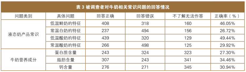 首先,在牛奶产品常识部分设置了4个基本问题,分别对应一种液态奶类产品,在选项中分别设置了关于该类产品的保质期、保存方式、制作工艺等一些基本问题。从回收的有效问卷结果来看,居民对这4个基本问题回答的正确率均低于50%。其次,从对牛奶营养成分了解程度来看,能准确了解牛奶中蛋白质、脂肪与钙含量区间的被调查者仅占三成左右(表3)。低温鲜奶作为当前国内牛奶市场上的“新宠”,被调查者显得更为“陌生”,在调查中,绝大多数被调查者还不能将低温鲜奶与常温白奶有效进行区分,低温酸奶与常温酸奶是否存在“活菌”这一问题, 也同样让大多数被调查者难以做出正确的选择。因此,从以上调查结果来看,牛奶虽然作为日常生活中较为普遍的饮品,但居民对牛奶产品特征的了解知识不多,应当注重加强对居民牛奶产品消费常识的科普,提高居民对不同牛奶产品的认识了解程度。