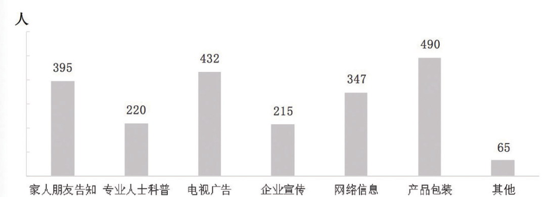 居民在日常生活中会接收来自多方的信息,信息内化会形成自己的某种思维方式或认知观念,牛奶作为生活中常见的食品,信息传播渠道相当广泛。在本次调查中, 居民获取牛奶相关信息的渠道来源主要是超市货柜信息(产品包装)以及各大乳品企业的电视广告和网络信息;其次是家人、朋友等身边人告知;最后是专业人士的科普活动。由此可以看出, 居民牛奶知识来源渠道相对单一,乳品企业的商业推广以及网络信息是居民获取牛奶营养知识的主要渠道,但为了保证居民获取的营养知识的权威公正,仍需要政府或有关机构加大对居民营养知识的科普力度(图3)。