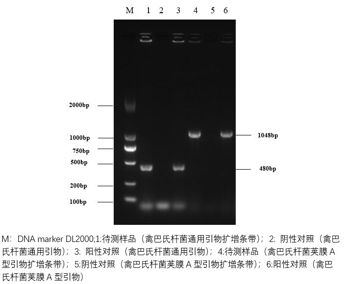 用荚膜分型引物进行PCR扩增,结果显示为A型多杀巴氏杆菌阳性。