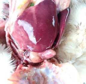 本场爆发的鸡霍乱病例中多为急性病例,鸡群并未见明显的临床症状,多数鸡突然死亡。少部分鸡精神倦怠、离群呆立,少见甩头症状。病鸡排黄绿色稀粪,呼吸加快。体重较大的鸡死亡率较高,剖检可见鼻腔有泡沫状粘液,鸡冠苍白水肿;气管有卡他性渗。心脏脂肪和外膜出血,肝脏有明显的白色坏死点;十二指肠粘膜红肿。