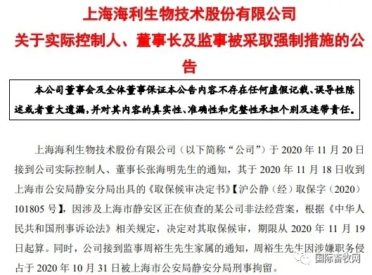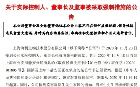 根据海利生物公告,公司在11月20日接到公司实际控制人、董事长张海明通知,其于2020年11月18日收到上海市公安局静安分局出具的《取保候审决定书》,因涉及上海市静安区正在侦查的某公司非法经营案,决定对其取保候审,期限从2020年11月19日起算。