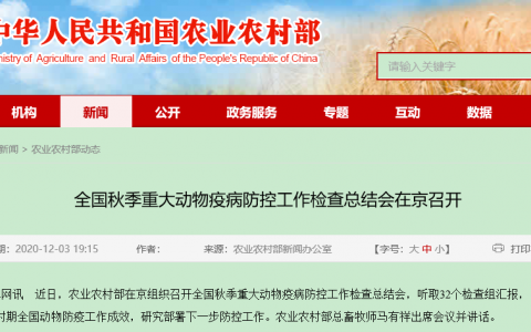 农业农村部12月3日讯 近日,农业农村部在京组织召开全国秋季重大动物疫病防控工作检查总结会,听取32个检查组汇报,回顾“十三五”时期全国动物防疫工作成效,研究部署下一步防控工作。农业农村部总畜牧师马有祥出席会议并讲话。