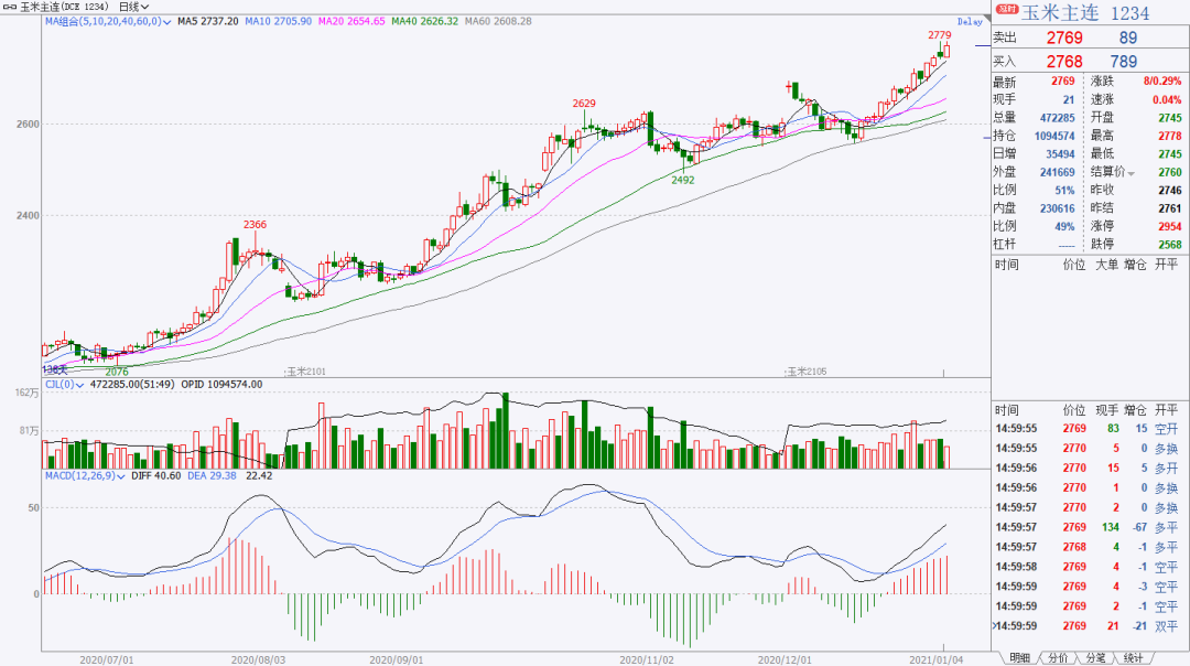 新年伊始,玉米现货价格连续6天大范围上涨,截止目前玉米依然较为强势,其中40多家企业上涨,潍坊地区玉米价格冲高到2800+。期货方面,2021年开盘首日玉米主力合约触及2779元/吨新高位。
