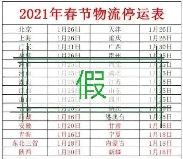 近日,网上出现了一张2021年春节物流的停运表,按照表上时间来看,今年全国物流将于1月27日前陆续停运,最早的地区在1月16日就停运。随后有媒体辟谣,这张表格是假的!