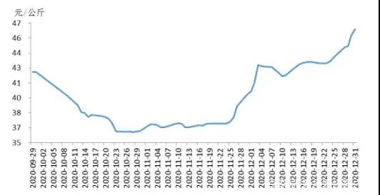 根据农业农村部信息中心和卓创资讯的联合监测数据,从2020年11月下旬开始,国内猪肉价格回升势头更加明显。截至2020年的最后一周,16省(直辖市)瘦肉型白条猪肉出厂价格总指数的周平均值为每公斤45.37元,基本为2020年内的最高水平。