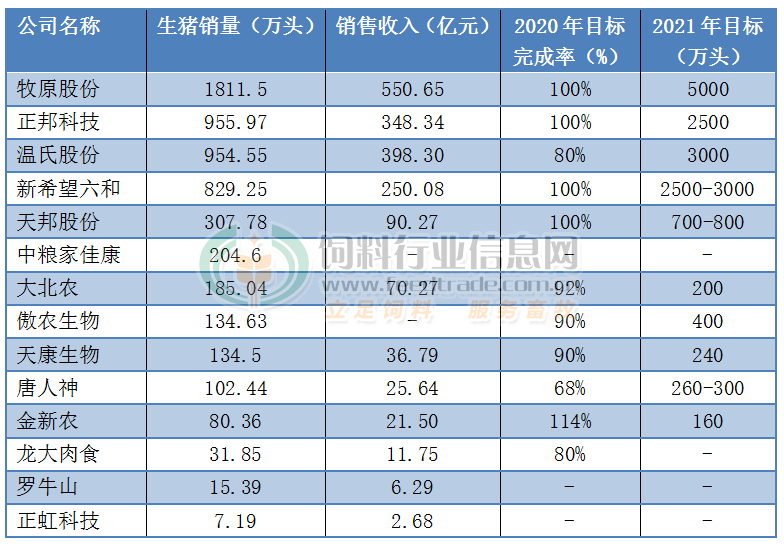 上市猪企的生猪销售业绩陆续出炉,中国饲料行业信息网根据上市公司公告统计了14家猪企2020年的出栏生猪成绩,见下表: