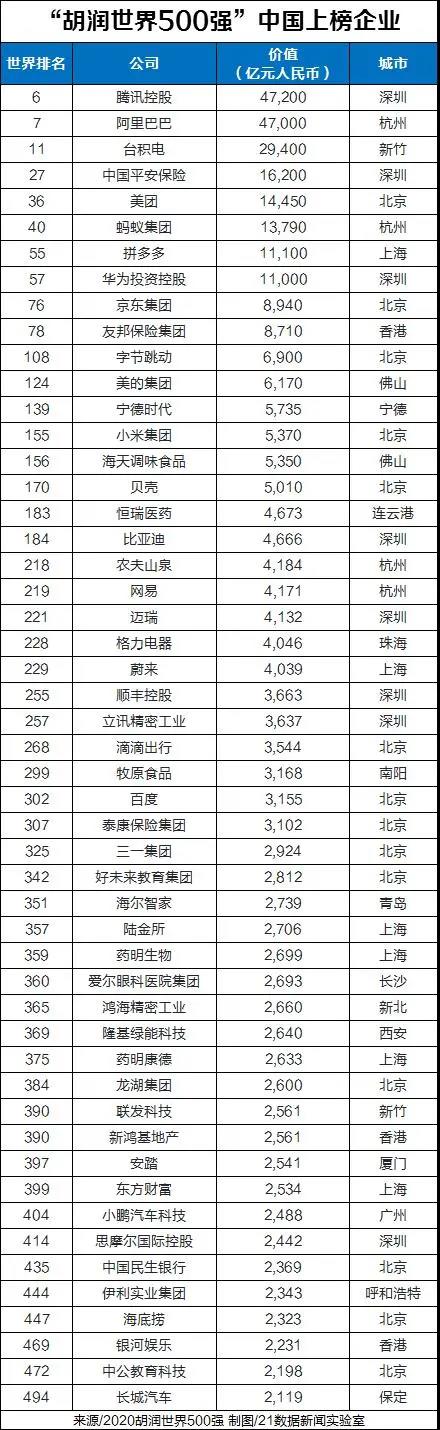 1月12日,《2020胡润世界500强》榜单公布,列出了世界500强非国有企业,按照企业市值或估值进行排名。这是胡润研究院继两次发布“胡润中国500强”之后,首次发布“胡润世界500强”榜单。