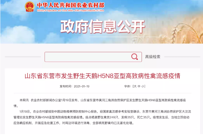 1月19日,农业农村部接到中国动物疫病预防控制中心报告,经国家禽流感参考实验室确诊,东营市黄河三角洲自然保护区大汶流管理站发生野生天鹅H5N8亚型高致病性禽流感疫情。疫点栖息野生禽类249只,发病35只,死亡35只。疫情发生后,当地立即启动应急响应机制,开展应急处置工作,对周边环境进行消毒,全部病死野禽均已无害化处理。