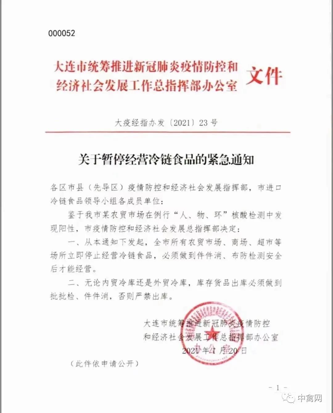 1月20日起,大连暂停所有冷链食品经营!昨日,大连疫情防控指挥部发布关于暂停经营冷链食品的紧急通知: