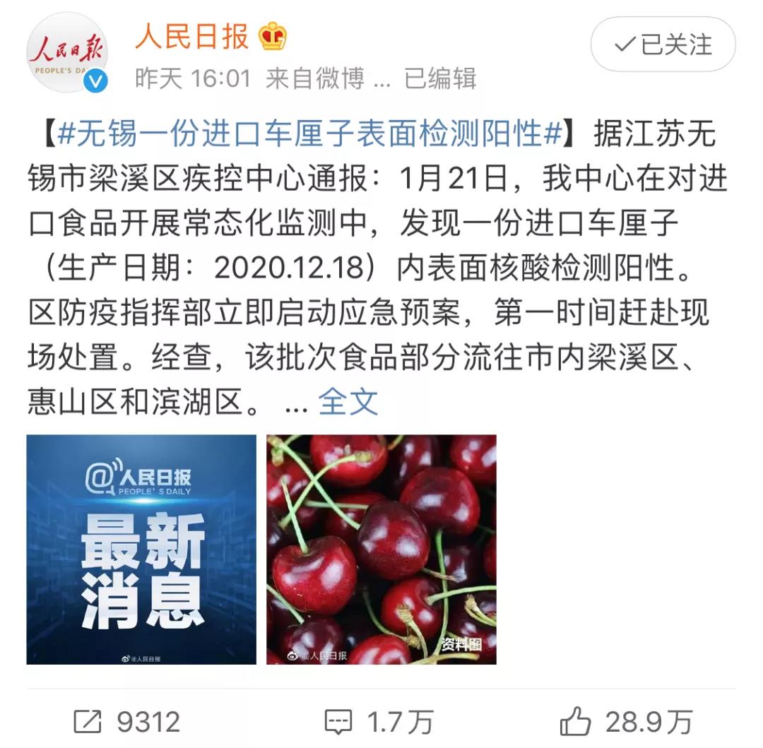 消息放出来后,#无锡一份进口车厘子表面检测阳性# 立刻带着焦虑冲上了热搜。