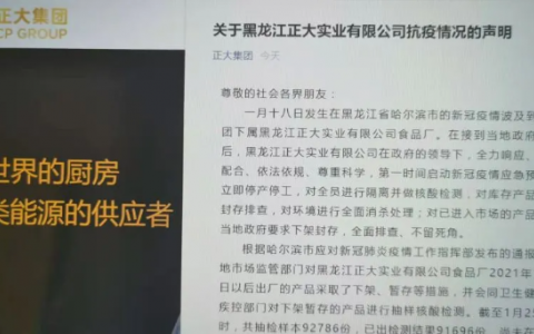声明显示,1月18日,正大集团下属黑龙江正大实业食品厂受到黑龙江省哈尔滨市新冠疫情波及,接到当地政府通知后,黑龙江正大实业全力响应政府领导,第一时间启动新冠疫情应急预案,立即停产停工,对全员进行隔离并做核酸检测,对库存产品全面封存排查,对环境进行全面消杀处理;对已进入市场的产品按照当地政府要求下架封存,全面排查、不留死角。