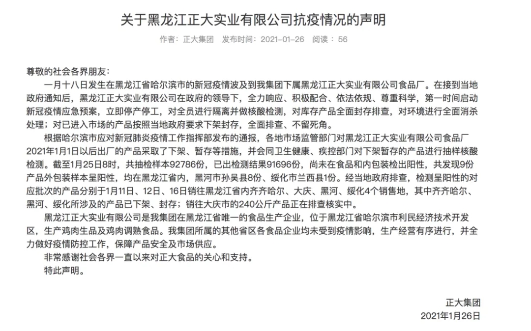 正大集团还表示,黑龙江正大实业有限公司是集团在黑龙江省唯一的食品生产企业,位于黑龙江省哈尔滨市利民经济技术开发区,生产鸡肉生品及鸡肉调熟食品。集团所属的其他省区各食品企业均未受到疫情影响,生产经营有序进行,并全力做好疫情防控工作,保障产品安全及市场供应。