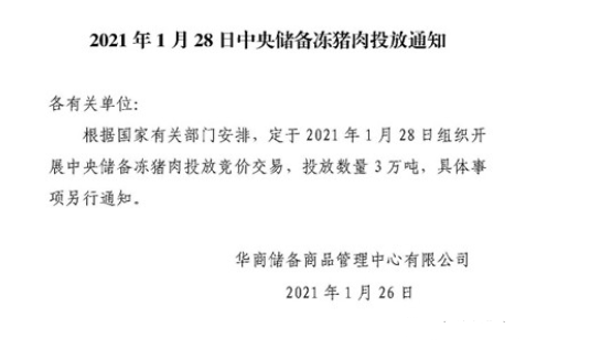 华储网消息,1月28日,中央储备冻猪肉将投放3万吨。据统计,这已经是2021年以来国家第4次投放中央储备冻猪肉,加上华商储备商品管理中心有限公司1月7日、15日、21日分别投放的2万吨、3万吨、3万吨中央储备冻猪肉,2021年以来,国家已投放中央储备冻猪肉11万吨。