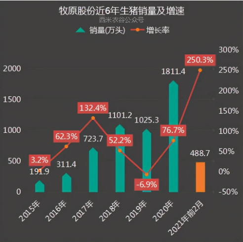 3月7日,牧原股份发布2021年1-2月份生猪销售简报,2021年1-2月,公司销售生猪488.7万头,同比暴增250.3%,销售收入122.81亿元,同比猛增165.6%。其中向全资子公司牧原肉食品有限公司销售生猪27.8万头。牧原生猪出栏量数据非常亮眼,交出了漂亮的成绩单。