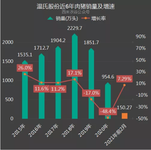 而温氏3月5日发布公告显示,2021年2月销售肉猪49.87万头,收入16.79亿元,毛猪销售均价28.44元/公斤,环比变动分别为-50.33%、-58.75%、-16.82%,同比变动分别为-6.12%、-31.19%、-25.16%。
