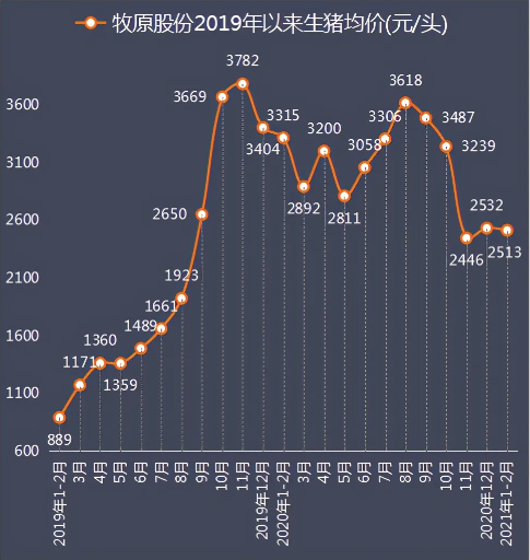 2021年1-2月,牧原股份生猪头均价格为2,512.99元,另有消息称,牧原股份仔猪销售盈利大,猪场均重7.19公斤的仔猪售价高达1810元,也即单价高达252元/公斤,远高于农业部官网披露的2月24日全国500个农村集贸市场仔猪91.39元/公斤的平均价格。
