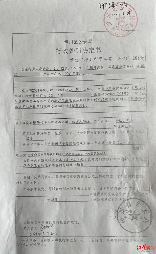 事发一个月后,2021年3月5日,伊川县公安局对涉事的肉联厂经理李晓刚,以“阻碍执行职务”作出了行政拘留5日、罚款500元的行政处罚。