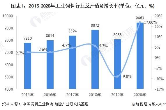 2019年受全球经济环境变化及猪瘟疫情影响,全国饲料工业总产值8088.1亿元,营业收入7780.0亿元,双双下跌。2020年,随着生猪生产持续恢复以及在家禽存栏高位、牛羊产品产销两旺等因素的推动下,全国工业饲料行业规模再创新高,总产值9463.3亿元,同比增长17.0%;总营业收入9072.8亿元,同比增长16.6%。