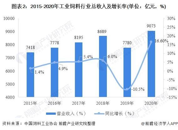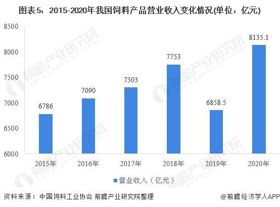 营收方面,我国饲料产品营业收入走势与产值走势同步,2015-2018年,饲料产品营业收入持续增长,2019年整体出现大幅下滑,2020年,随着市场回暖,我国饲料产品总营收迅速恢复增长势头,全年营业收入为8135.1亿元,同比增长16.9%。