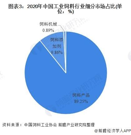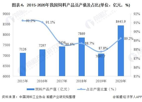 2020年,随着下游市场需求的回升,我国饲料产品产值回升至8445.9亿元,同比增长17.3%,饲料产品市场份额也提升至89.2%。