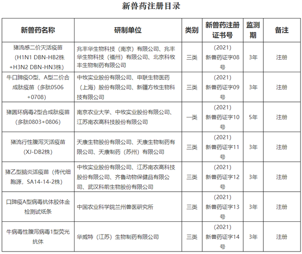 根据《兽药管理条例》和《兽药注册办法》规定,经审查,批准兆丰华生物科技(南京)有限公司等15家单位申报的猪流感二价灭活疫苗(H1N1 DBN-HB2株+H3N2 DBN-HN3株)等7种兽药产品为新兽药,核发《新兽药注册证书》,发布产品制造及检验试行规程、质量标准、说明书和内包装标签,自发布之日起执行。
