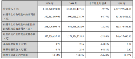3月29日,仙坛股份(002746)近日发布2020年度报告,报告期内公司实现营业收入3,188,320,694.09元,同比下滑9.77%;归属于上市公司股东的净利润352,563,069.06元,同比下滑64.77%。