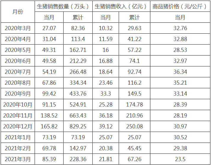 新希望4月8日公布2021年3月生猪销售情况简报。公司2021年3月销售生猪85.39万头,环比变动22.37%,同比变动215.44%;收入为21.81亿元,环比变动7.02%,同比变动111.34%;商品猪销售均价23.50元/公斤,环比变动-20.01%,同比变动-28.27%。