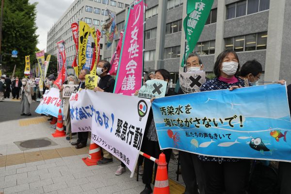4月13日,抗议者在日本东京的首相官邸外反对福岛核污水排入大海。(新华社)