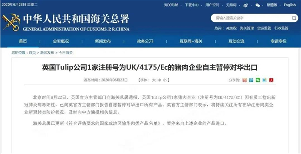 根据中国海关公告,北京时间2020年6月22日,英国官方主管部门向海关总署通报,英国Tulip公司1家猪肉企业(注册号为UK/4175/EC)因有员工检出新冠肺炎病毒阳性,已向英官方主管部门报告自愿暂停对华出口所有产品。