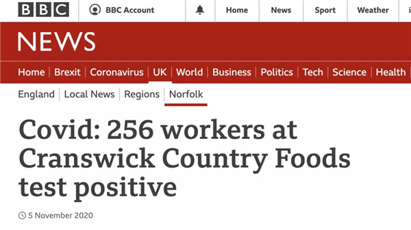 英媒报道称,除了Tulip(后更名为Pilgrim UK)外,在伦敦上市的肉类加工企业克兰斯威克(Cranswick)去年10月也爆发了新冠疫情,位于诺福克的加工厂超过250名员工确诊。
