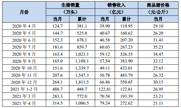 牧原股份5月7日公布2021年4月份生猪销售简报。2021年4月份,公司销售生猪314.5万头,销售收入79.24亿元。其中向全资子公司牧原肉食品有限公司及其子公司合计销售生猪18.8万头。