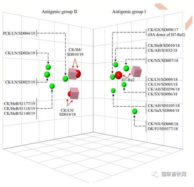 自2018年12月以来,使用两种H5种子病毒(Re-11和Re-12Re12)和1种H5/H7三价灭活疫苗已用于家禽。H5/H7三价灭活疫苗是否能完全预防抗原变异的H7N9病毒?以10只3周龄雌性SPF鸡为试验组,肌肉注射0.3 ml疫苗或等量PBS作为对照。用H7N9高致病性禽流感病毒攻击后,所有对照鸡都通过咽和泄殖腔排出病毒,并在攻击后5天内死亡。用CK/GX/SD098/17或CK/SX/SD006/18攻击的免疫鸡在任何时间点均未检测到病毒脱落。然而,用PCK/LN/SD004/19攻击的10只免疫鸡中的2只和用CK/IM/SD010/19或CK/LN/SD25/19攻击的10只免疫鸡中的5只都会释放病毒。所有接种疫苗的鸡都明显健康,并在攻击后的两周观察期内存活。这些结果表明,H5/H7-Re2三价疫苗具有免疫原性,对鸡H7N9病毒(I组)具有充分的保护作用,但不能完全阻止抗原变异组H7N9病毒(II组)的复制。