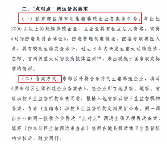 3、东部区自2021年12月1日开始试点生猪“点对点”调运备案管理制度。禁止接收大区外非“点对点”调运备案管理的生猪(种猪、仔猪以及非洲猪瘟等重大动物疫病无疫区、无疫小区生猪除外)。