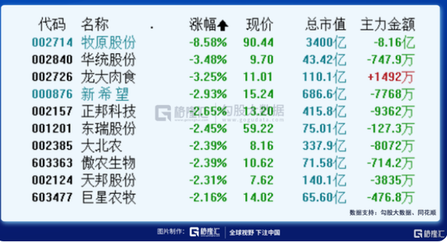 “猪中茅台”罕见地触及跌停。截止24日收市,牧原股份跌8.58%,报90.44元,日成交53.61亿元,资金净流出2.05亿元,公司总市值为3400亿元。