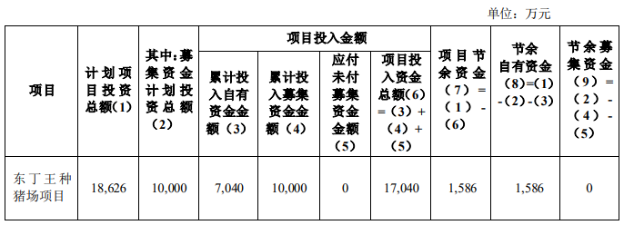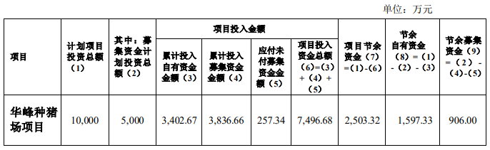 截至2020年12月3日,华峰种猪场项目已经建设完成,达到预定可使用状态,公司决定对该项目进行结项,具体情况如下: