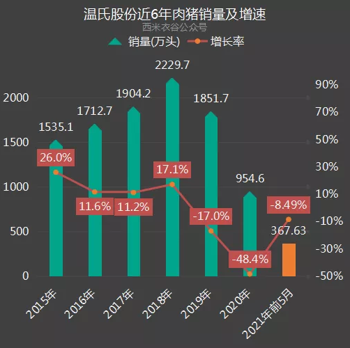 2021年前五月,公司共销售肉猪367.63万头,同比减少8.49%。公司近六年及2021年前五月肉猪销售情况如下: