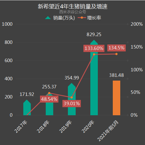 2021年前五月,公司销售生猪累计381.48万头,同比大增134.5%。新希望近四年及2021年前五月生猪销量情况如下: