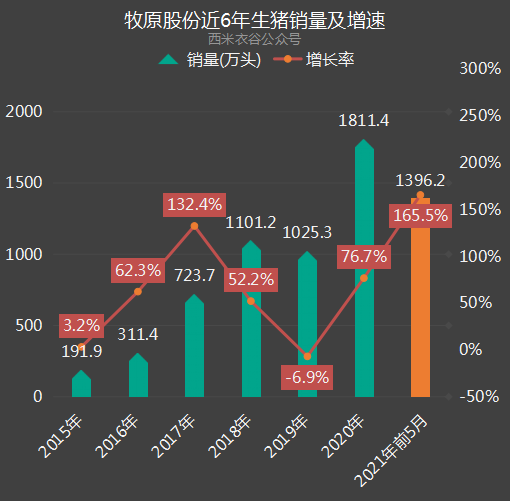 2021年前五月,公司共销售生猪1,396.2万头,同比大增165.5%。公司近六年及2021年前五月生猪销售情况如下:
