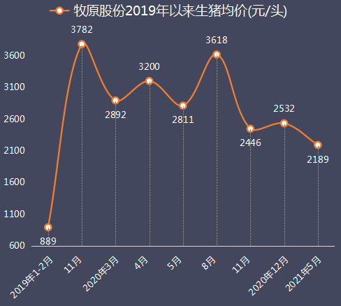2021年5月,牧原股份生猪头均收入为2,189.22元。2019年1月以来,公司生猪头均价格如下: