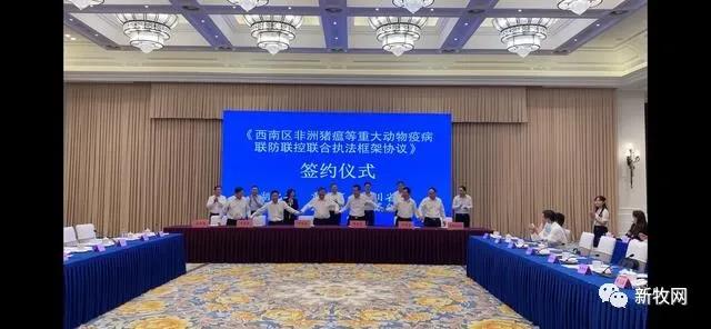 农业农村部西南区分区防控指导组、中国动物疫病预防控制中心负责人介绍了当前重大动物疫病防控重点要点。六省农业农村部门分别通报了近期非洲猪瘟等重大动物疫病防控和生猪复产情况,并现场签订《西南区非洲猪瘟等重大动物疫病联防联控联合执法框架协议》。