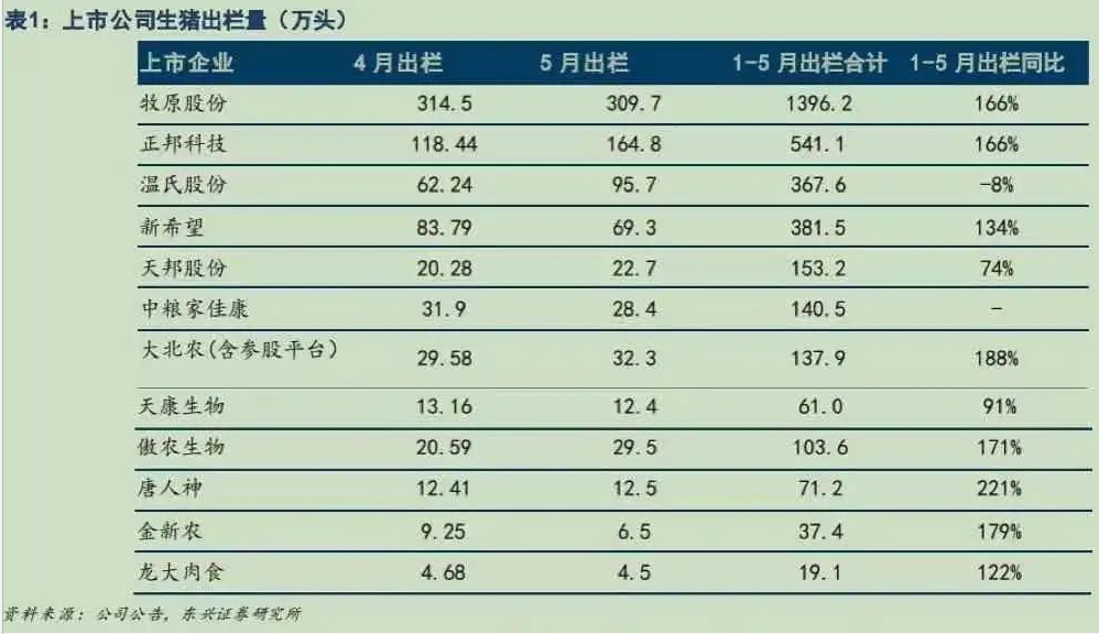 今年前5个月的生猪出栏量,牧原股份的行业首位度得到进一步巩固,正邦科技稳坐第二位,新希望夺得第三位。但在绝大部分猪企同比出现三位数增长的情形下,温氏股份进一步下降8%,跌落至第四位。