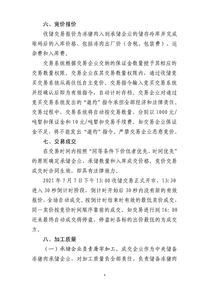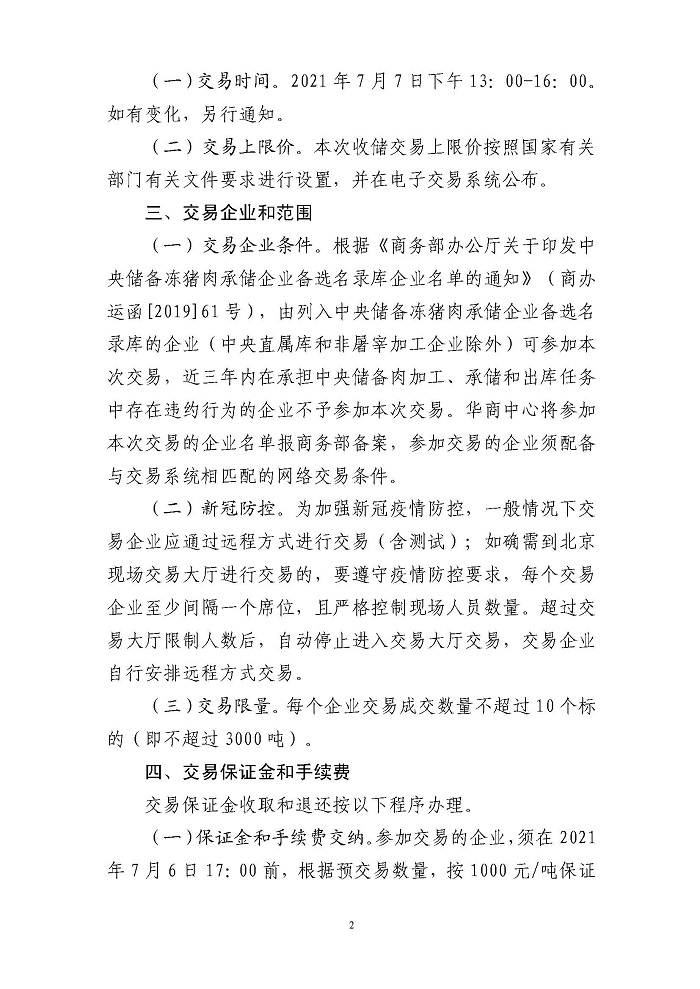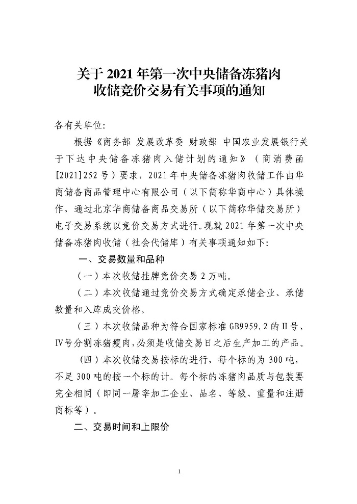 华储网7月4日消息,2021年第一次中央储备冻猪肉收储竞价交易2万吨。交易时间为2021年7月7日下午13时至16时。