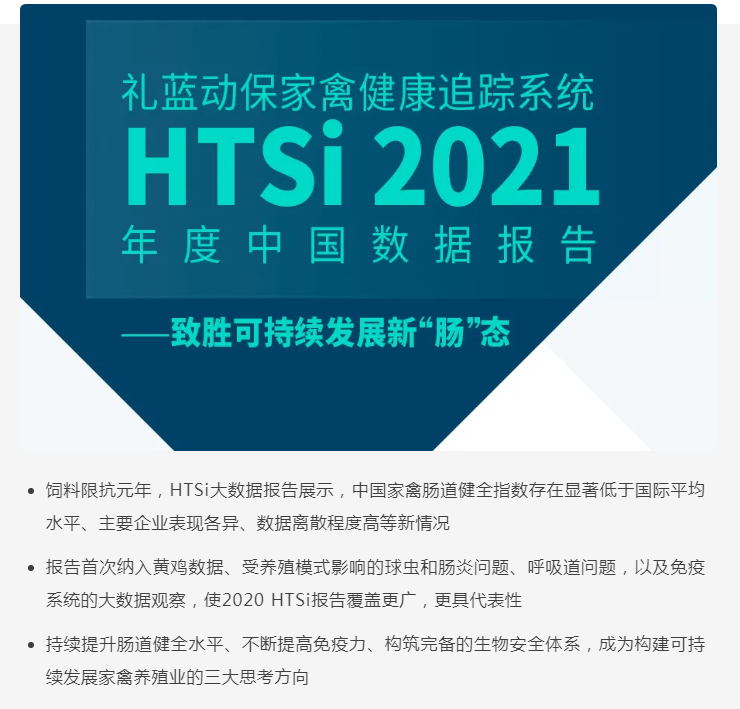 家禽健康追踪系统(Health Tracking System,以下简称“HTSi系统”)是礼蓝动保推出的一套家禽健康数据管理系统,旨在通过持续、定期的家禽健康监测,为养殖企业提供数据评估支持,为决策判断提供参考依据,帮助企业不断提升养殖水平,争取投资回报最大化。从2019年起,礼蓝动保每年公布HTSi数据分析报告,与中国家禽养殖业分享大数据养殖时代的最新研究发现和实践经验。