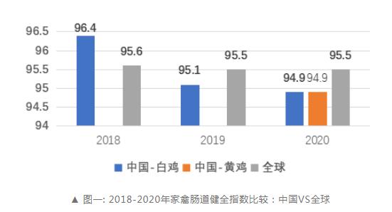 此次报告数据采集时段从2018年1月到2020年12月,聚焦影响生产性能的肠道健全、呼吸道健全、免疫系统等指标,通过持续、定期的家禽健康监测,为企业的养殖决策提供大数据支持。其中黄羽肉鸡相关指标及趋势数据属首次发布,为中国黄鸡的养殖提供重要参考。2020年,中国家禽肠道健全指数为94.9,与2019年一样持续的低于全球均值(2020年全球家禽肠道健全指数为95.5)。