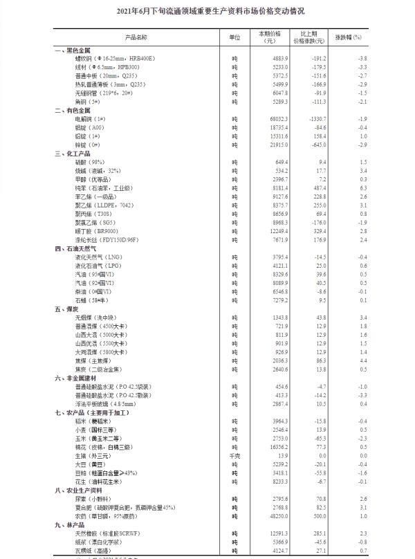 记者从国家统计局网站获悉,据对全国流通领域9大类50种重要生产资料市场价格的监测显示,2021年6月下旬与6月中旬相比,29种产品价格上涨,20种下降,1种持平。其中,生猪(外三元)价格13.9元/千克,与6月中旬相比持平。