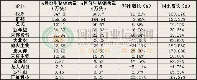 近日,上市企业6月份生猪销售简报纷纷出炉,13家养猪上市企业生猪销量环比增减参半,6月总共出栏生猪798.96万头左右,环比增长4.55%。1-6月13家企业生猪销售总量为4088.96万头,与去年同期相比大幅增长。