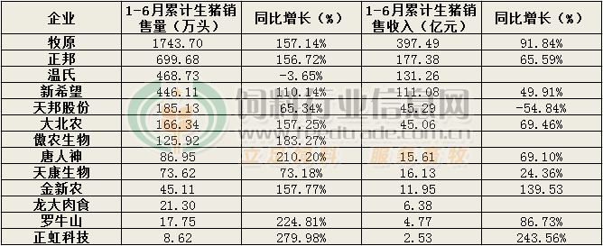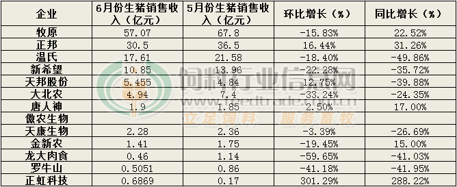 而销售收入方面,虽6月份生猪销售量同比除龙大肉食小幅下降外,其余企业销量均同比大增,但受生猪价格在年后大幅走跌影响,6月份仅正邦、天邦、唐人神、正虹科技销售收入环比上涨,其余企业销售收入均下滑。牧原6月份销售收入仍稳居第一,6月份销售收入57.07亿元。