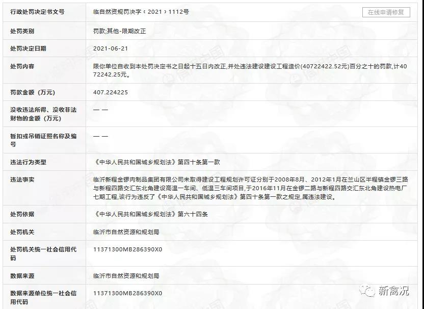 近期,临沂新程金锣肉制品集团有限公司(下称“金锣集团”)新增一条行政处罚内容。因在未取得建设工程规划许可证的情况下,分别建设车间项目、热电厂七期工程,金锣集团被临沂市自然资源和规划局罚款407.22万元。